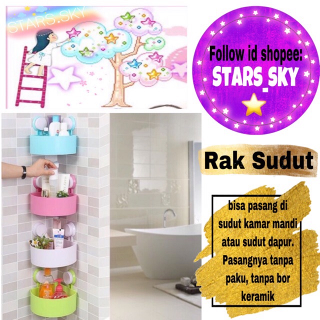 Harga yg tercantum adalah harga ecer per 1 rak, BUKAN harga persusun 4 warnaHARAP MENCANTUMKAN WARNA YANG DI ORDER DI KOLOM KETERANGAN INVOICE PESANAN, JIKA TIDAK, MAKA AKAN DIKIRIM WARNA RANDOM = NO COMPLAIN!!Barang tidak bergaransi ya, jika terjadi kerusakan saat pengiriman = no retur = no refund = no complain!Order = setuju apabila warna yg di pesan / di cantumkan kosong maka warna / motif akan kami kirim acak sesuai stock yg tersedia saat itu tanpa konfirmasi dahulu = no complain Ga setuju = jgn orderRak serbaguna yang dipasang di sudut, bisa di sudut kamar mandi atau sudut dapur. Pasangnya tanpa paku, tanpa bor keramik. Tempelannya model karet hisap, daya hisapnya kuat, ada tombol pemutar.Rak sudut serbaguna berfungsi untuk tempat sabun, perlengkapan mandi atau tempat botol bumbu dapur. Dengan rak sudut ini tampilan kamar mandi jadi modern, isi kamar mandi jadi rapi.Rak hanya bisa dipasang di permukaan yang licin dan rata seperti kaca atau keramik. Cara Pasang :- Lap bersih permukaan yang hendak dipasang, lalu keringkan - Lap bersih permukaan karet hisap- Tempel rak ke keramik, lalu putar pemutar hingga karet hisap melekat kuatSize : 14.5 x 14.5 x 7 cm / 1 rakMaterial : Plastik ABSNON GARANSI BARANG SEBELUM KIRIM SUDAH DI CEK TERLEBIH DAHULU / QC JADI MOHON MAAF TIDAK MENERIMA PENUKARAN / COMPLAIN DENGAN ALASAN APAPUN, TERJADI KERUSAKAN SAAT PENGIRIMAN (Baret, Rusak, Pecah, kotor, Robek, quantity kurang dll) DI LUAR TANGGUNG JAWAB SELLER = NO COMPLAIN!Ga setuju = jgn orderSilahkan tambah pembelian bubble biar barang pesanan anda lbh aman saat pengiri