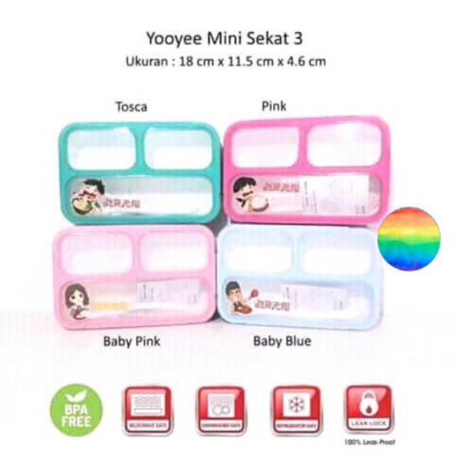 Dimensi (p x l x t) : 18 x 11.5 x 4.6 cm - Ditutupnya terdapat karet antar sekat, sehingga makanan tidak bercampur - Bahan plastik tebal BPA Free - Tahan panas sampai 120 degC - Dilengkapi sendok Kelebihan: 1. Terbuat dari bahan yang berkualitas untuk makanan, aman dan tidak membahayakan 2. Tidak berbau plastik bahkan menggunakan air mendidih di dalamnya 4. Bahan berkualitas yang tahan terhadap panas atau dingin 5. Dapat digunakan untuk pemasanan menggunakan microwave, menyimpan pada kulkas, dan mesin cuci piring (Dishwasher) 6. Tahan panas sampai 120 DegCWarna tolong tanyakan stok dulu yaa,atau dikirim ra