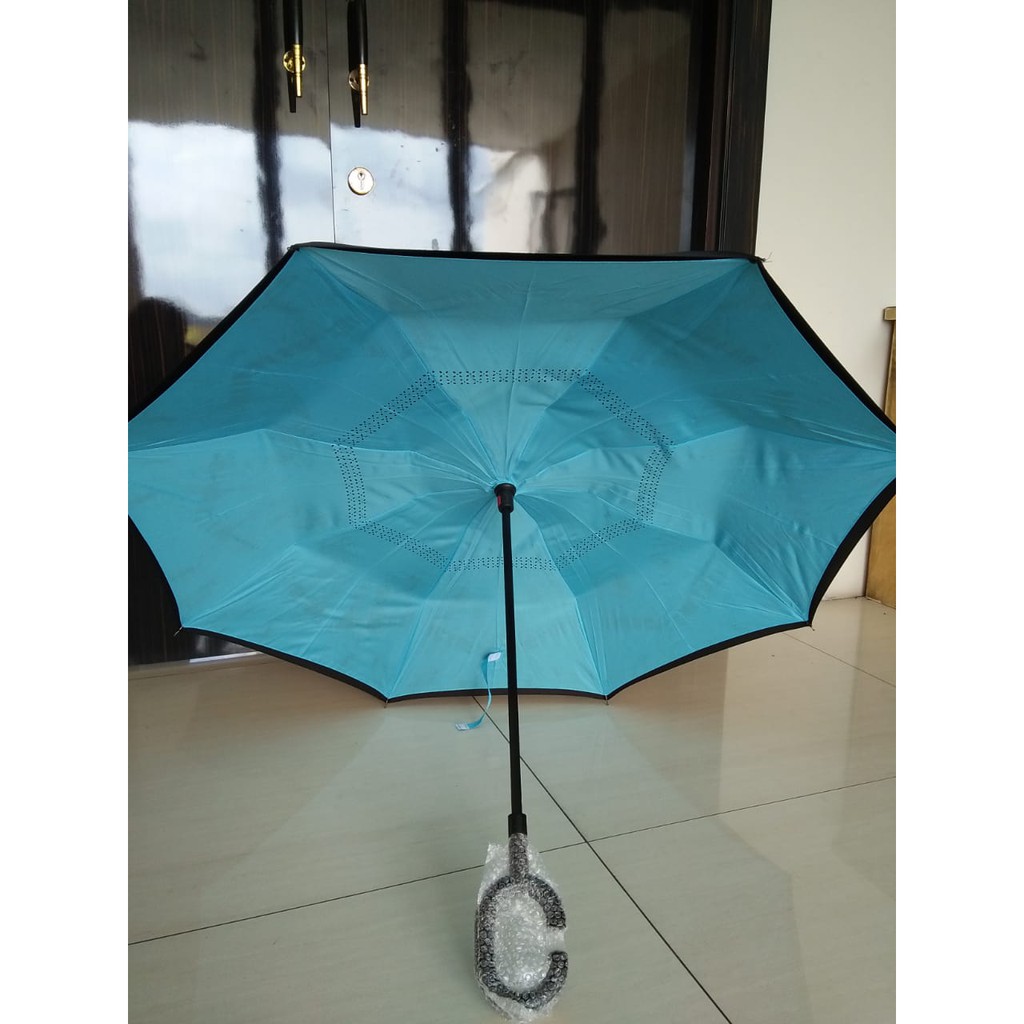 Perhatian: Karena ini payung terbalik, maka rangka payung akan terlihat terbalik juga. Perhatikan di gambar. Perhatikan warna sarung sesuai dengan warna dalam payung, karena payung ini terbalik maka warna yang terlihat di sarung tidak sesuai dengan warna payung pas dikembangkan. Kazbrella memiliki ruang mekanisme pergerakan lebih kecil dan hemat tempat dengan mengisolasi bagian kanopi basah dari pengguna. Dan pergerakan seperti ini meminimalisir kesempatan ujung payung mencolok mata orang-orang di sekitar saat kita menutupnya. Payung merupakan salah satu alat tertua, dan 3.000 tahun setelah ia ditemukan, akhirnya seseorang menginovasi desainnya.Kemampuan lain Kazbrella dibanding payung biasa adalah ia dapat menahan angin lebih kuat. Angin ialah faktor yang paling sering merusak payung. Dengan desain standar, payung akan rusak jika struktur jari-jari tak mampu menahannya. Masalah ini tak akan mengancam Kazbrella karena ia memiliki engsel terbalik, dan Anda tetap bisa membuka dan menutup payung di kondisi angin kencang sekal